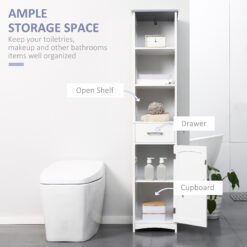 For spaces which are small and are hard to find a use for, invest in a tallboy cabinet – just like this kleankin piece, sized at 163 x 34cm. It’s formed of three top shelves, a middle drawer and a bottom cabinet, making it a super spacious piece for keeping all bathroom essentials safely stored together. The MDF structure is durable and resilient, with anti-tipping straps to safely attach to the wall.