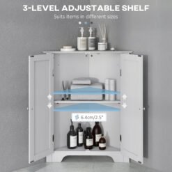 A simple bathroom unit, made ready for your home space. This kleankin bathroom furniture is formed into a triangular shape, making it easy to fit into corners. Inside, there is a shelf for two storage areas; it can be moved up and down to three different positions, making it easier to fit differently sized toiletries, towels and other products. The elevated base helps prevent moisture and liquids from getting inside.
