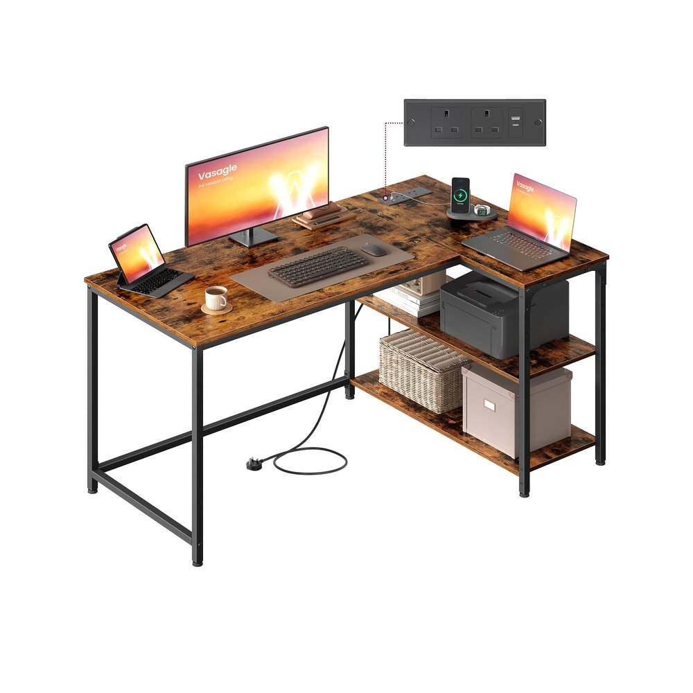 VASAGLE L Shaped Corner Desk, Computer Gaming Desk with Storage, Reversible Height-Adjustable Shelves, for Home Office, with Power Outlets 2 USB Ports, 110 x 80 cm, Ebony Black LWD131BE02