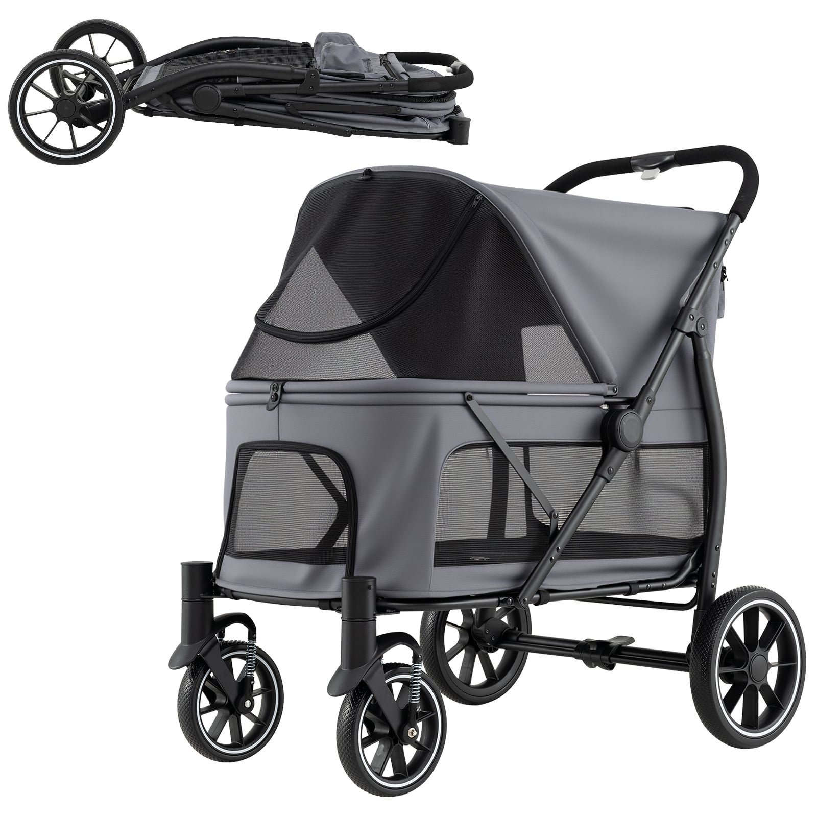 The no-zip closure and safety leash of the foldable dog stroller keep pets secure throughout every journey, while shock-absorbing front wheels glide smoothly across different surfaces. The 12″/30 cm low entry design is ideal for elderly or mobility-challenged pets, allowing stress-free access. Multi-sided mesh windows and a removable padded cushion provide maximum comfort and ventilation, and the adjustable canopy creates a well-aired environment to help reduce anxiety. Plus, front and top openings simplify entry and exit. Moreover, the foldable frame sets up in seconds with a simple button push, making the pet stroller easy to store & transport. In addition, there are multiple details. For example, the dog jogger is built from tear-resistant oxford cloth and metal frame, offering durability. 3 convenient storage pockets keep treats and essentials at hand, making the dog travel cart perfect for picnics, shopping trips, or vet visits. Spacious & Robust Structure: With an interior measuring 82 cm x 50 cm x 59 cm(L x W x H), the dog stroller easily accommodates 3-4 puppies, 1-2 medium breeds, or a single large dog. Its sturdy metal frame supports up to 40 kg, providing reliable strength for your pets. Note: Please measure the body length of your pet before purchasing.Easy One-Hand Folding: Featuring a convenient one-hand folding mechanism, the foldable pet stroller compacts quickly into a portable size, perfect for storing in apartments, loading into vehicles, or bringing on camping trips where space is at a premium.Effortless & Stable Rolling: Coming with 360° swiveling shock-absorbing front wheels and rear brakes with one-click quick brake system, the dog travel cart offers a stable, gentle ride over a variety of surfaces, from gravel road to pavement. Safety leash and non-zipper closure ensure extra security to prevent pets from slipping out.Pet-friendly Features: Multiple breathable mesh windows and 3 access points ensure excellent ventilation and easy entry or exit for your pet. The adjustable canopy shields your furry friend from the sun. Plus, the low rear entry is perfect for senior dogs. Also, the removable washable pad keeps the cart fresh and enhances comfort.More Considerate Details: The dog walking jogger is equipped with 3 storage pockets for carrying pet supplies and personal items on city walks or trips. The ergonomic foam-padded handle provides a comfortable grip during long strolls, and the simple assembly process saves time and effort.