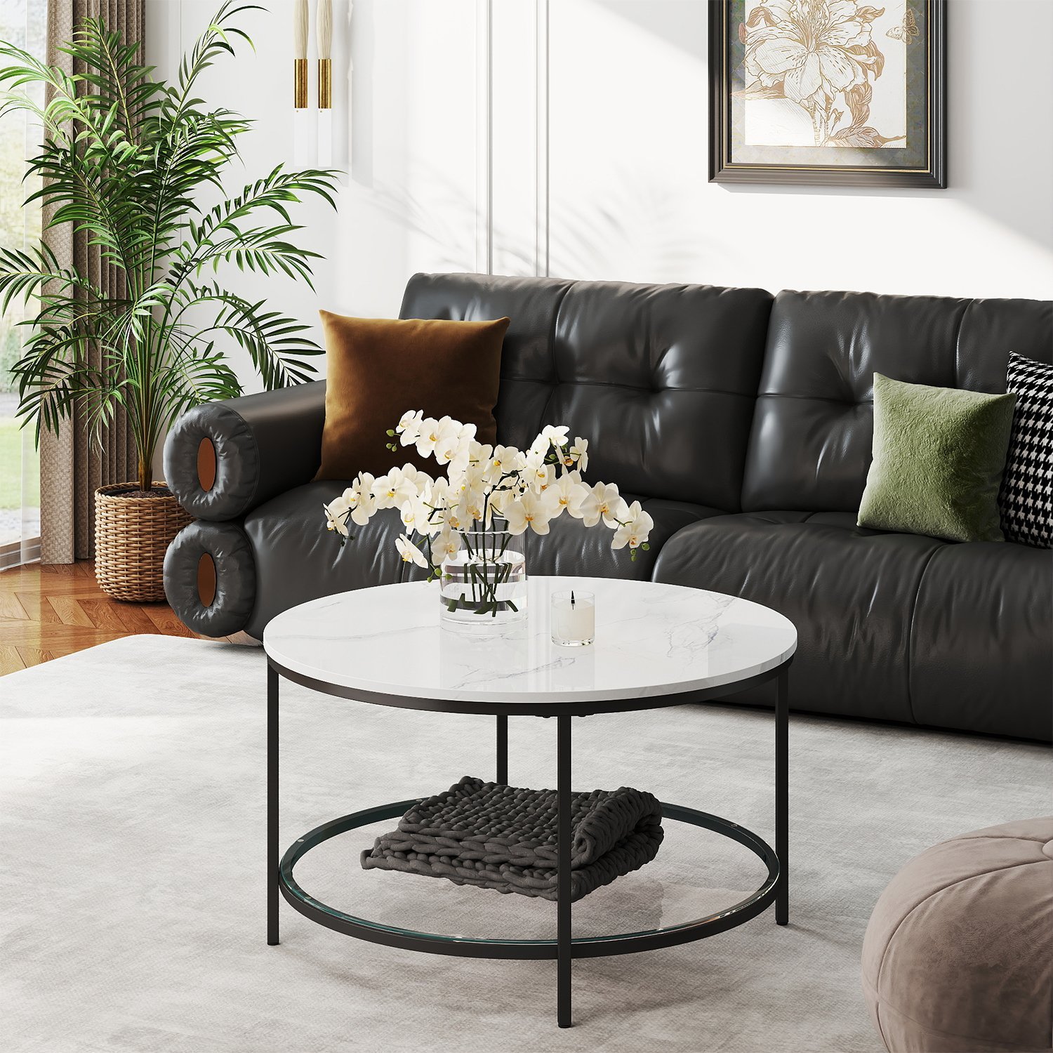Living Room Table, Sofa Cocktail Table Faux Marble Round, Modern Coffee Table, for Living Room, Marble White and Black