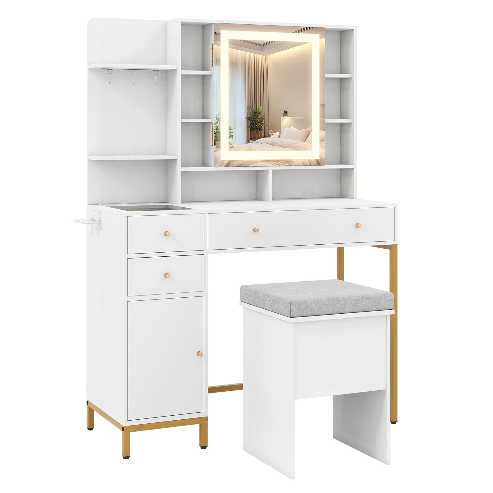 This makeup table features a built-in charging station for convenient device charging. The HD LED lighted mirror offers adjustable brightness and 3 color options to suit your needs. You can stay organized with ample storage including a mirrored cabinet, drawers, multiple open shelves and more. This stylish and practical dressing table set is perfect for your loved ones on special occasions, combining functionality and elegance beautifully. Built-in Charging Station: The charging station is equipped with 2 AC outlets, 1 USB port and 1 Type-C port. It allows you to charge your devices while you get ready, bringing you ultimate convenience within arm’s reach. HD LED Lighted Mirror: The lighted mirror features 3-color LED lights with 20%-100% adjustable brightness and a touch button, offering warm yellow, warm white or cool white lighting according to your needs.Large Storage Capacity: Your space will stay organized with 8 open shelves, 3 hooks, a cabinet with mirror door, 2 small drawers, a large drawer with divider, a side cabinet, and a hair dryer rack (can be installed to the left or right side). Transparent Glass Tabletop: The glass tabletop allows you to choose jewelry without opening the drawer and makes it easy to locate the items stored underneath. Plus, the cleaning is a breeze with a damp cloth. Stylish and Practical Addition: Perfect for personal use or for your wife, daughter, or friends on special occasions, this dressing table set serves both practical and decorative purposes beautifully.