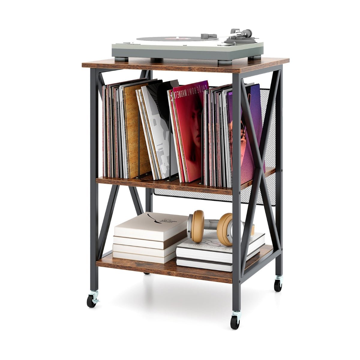 Mobile Record Player Stand with Vinyl Storage Shelves and Dividers-Rustic Brown