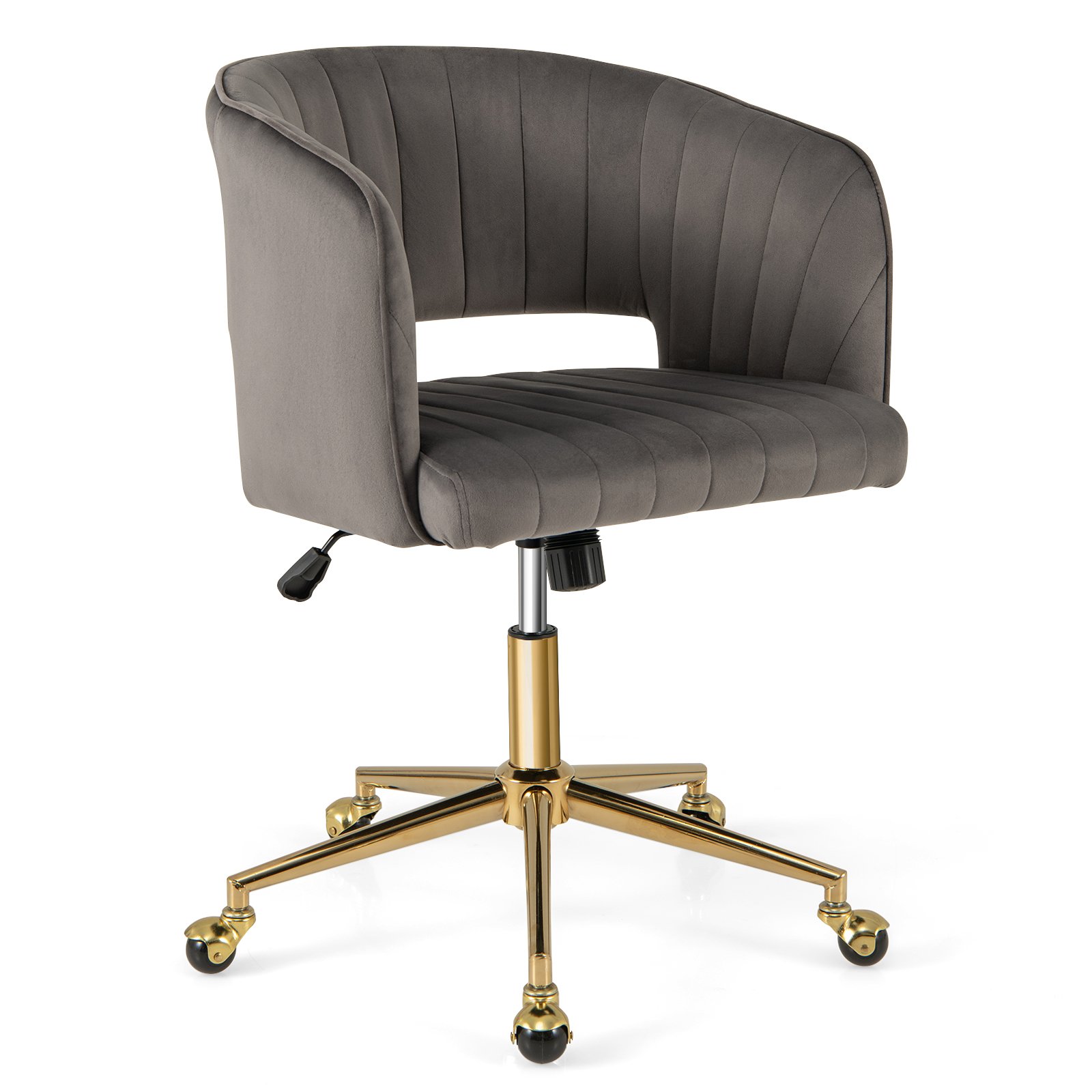 This velvet home office chair features a tufted back and seat filled with high-density sponge, providing a supportive and cozy experience for you. Additionally, the computer task chair offers a 360° swivel function, 90°-120° tilt option, and adjustable height to meet your different needs. Its 4 rolling wheels allow for effortless movement around your workspace. With a luxurious golden base, this chair is not only stylish but also sturdy, making it a versatile piece for your home. Whether you are getting ready in your bedroom, working in your study, or simply adding a touch of elegance to your living room, this modern swivel vanity chair is a perfect choice. Designed for Comfort: Crafted with comfort in mind, this velvet home office chair is designed with a tufted back and seat, both filled with high-density sponge. Even during extended hours sitting at your desk, you can sit comfortably and feel supported. Adjustable Features: The 360° swivel desk chair allows you to freely turn in any direction, complete with a 90°-120° tilt function so that you can recline for ultimate relaxation. Moreover, the adjustable height is suitable for people of different heights. Easy to Move around: Designed for effortless movement, this modern swivel vanity chair is equipped with 4 rolling wheels, which ensure you can navigate around your workspace with ease. Modern and Stylish Design: The chair’s golden base adds a luxurious touch and resilient build quality, making it a centerpiece in your home for years to come. No matter where it presents, this modern desk chair introduces a touch of elegance. Multipurpose Desk Chair: Whether you’re dressing up in your bedroom, conquering the workday in your study, or seeking a chic addition to your living room, this swivel velvet desk chair has you covered.