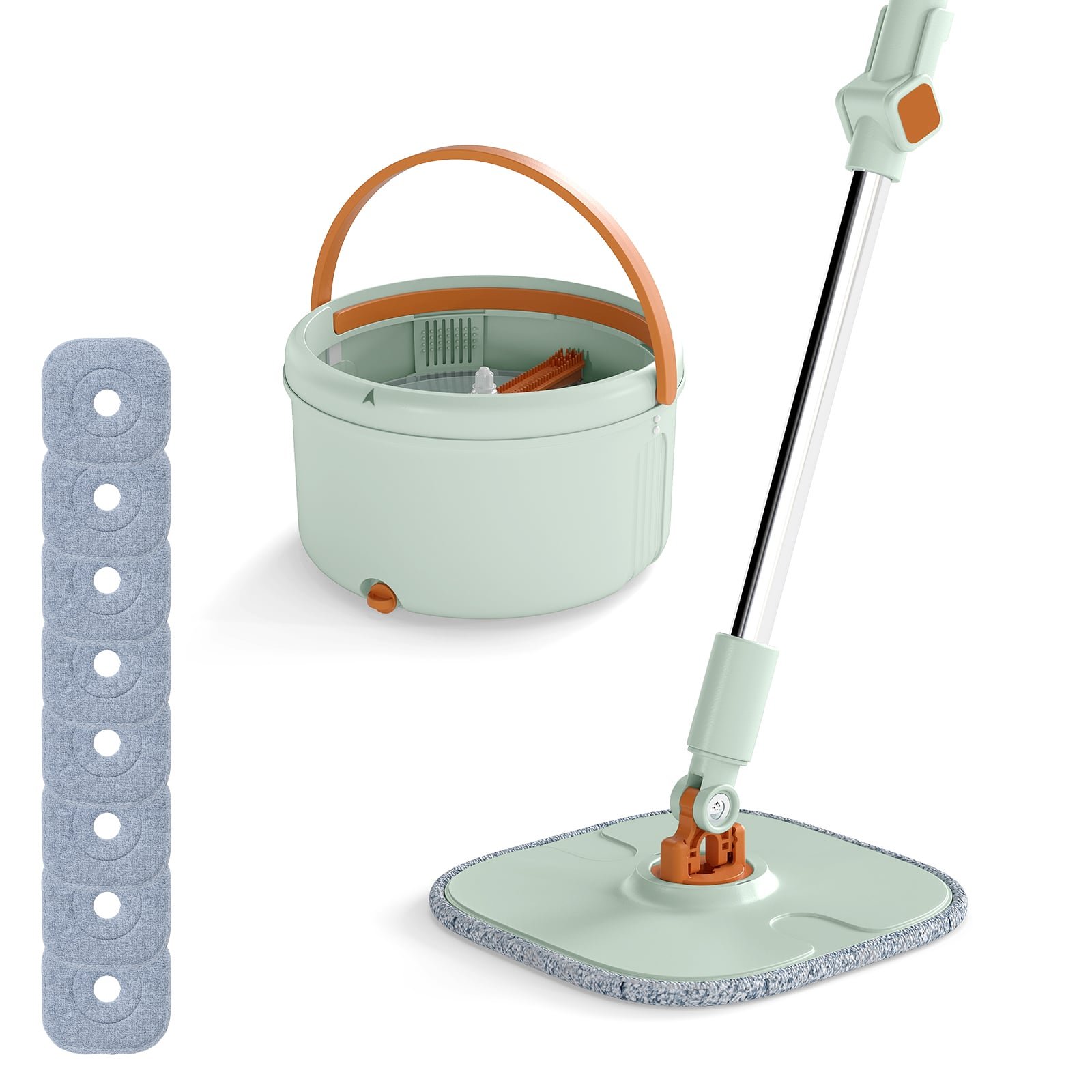 Thanks to the mechanical spray and comb scrubber, it also achieves hands-free mop washing. The 360° mop head is equipped with 2/8 microfiber pads that are machine washable, quick drying and offer strong water absorption. Additionally, the mop handle is length adjustable for your comfort. It is perfect for cleaning hardwood, tile, windows, and ceilings, even cleaning under low-clearance spaces as narrow as 6 cm. Thanks to the drainage hole, this set is also convenient to maintain. Scientific Separation System: The mop bucket’s internal partition separates clean water from dirty water, preventing cross-contamination and reducing water use. A built-in mechanical water spray and comb scrubber work together to clean fibers, while a filter basket traps debris. 360° Rotating Mop Head: The 360° rotating mop head of the floor cleaning system easily glides along baseboards, slips under sofas, and swivels deep into corners. Simply extend the telescopic handle to your height and clean the entire room in one smooth, continuous sweep. For Different Stains & Surfaces: Wet or dry, the flat floor mop handles it all – hardwood, tile, glass, even ceilings – leaving every surface effortlessly spotless. Moreover, the slim mop head slips under gaps as low as 6 cm, trapping oil, dust, and hair with ease. High-Quality Microfiber Pads: The floor mop set includes 2/8 rectangular reusable pads, made from plush microfiber, sponge, and nylon microfiber. Machine-washable and quick drying, these pads feature nylon threads to effectively trap pet hair with minimal effort. Easy to Maintain & Store: The mop and bucket set features an easy-to-separate construction and can drain quickly via a bottom drainage hole – no mess, no stress. It is also slim enough to slide into corners and light enough to carry room to room without a second thought.
