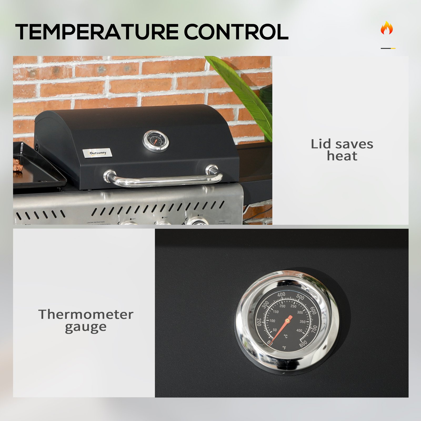 Sizzle and sear like a pro with this Outsunny deluxe BBQ. The two-in-one design combines a gas bbq and plancha grill. The 3825cm cooking surface is large enough to cook 8-16 servings. Gas grill features a lid: control the smokiness, with the thermometer to see inside temperature easily. Use the side burner to add extra sizzle. Complete with two wheels to move around easily.