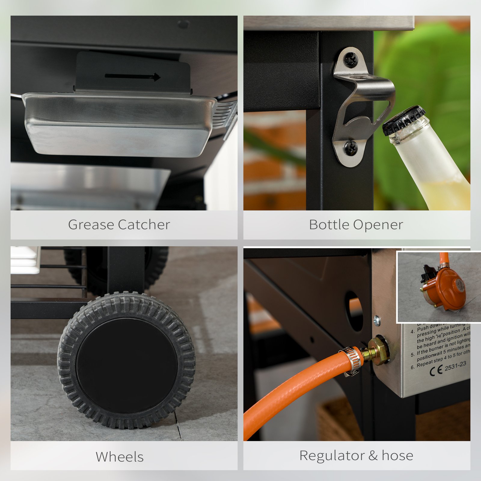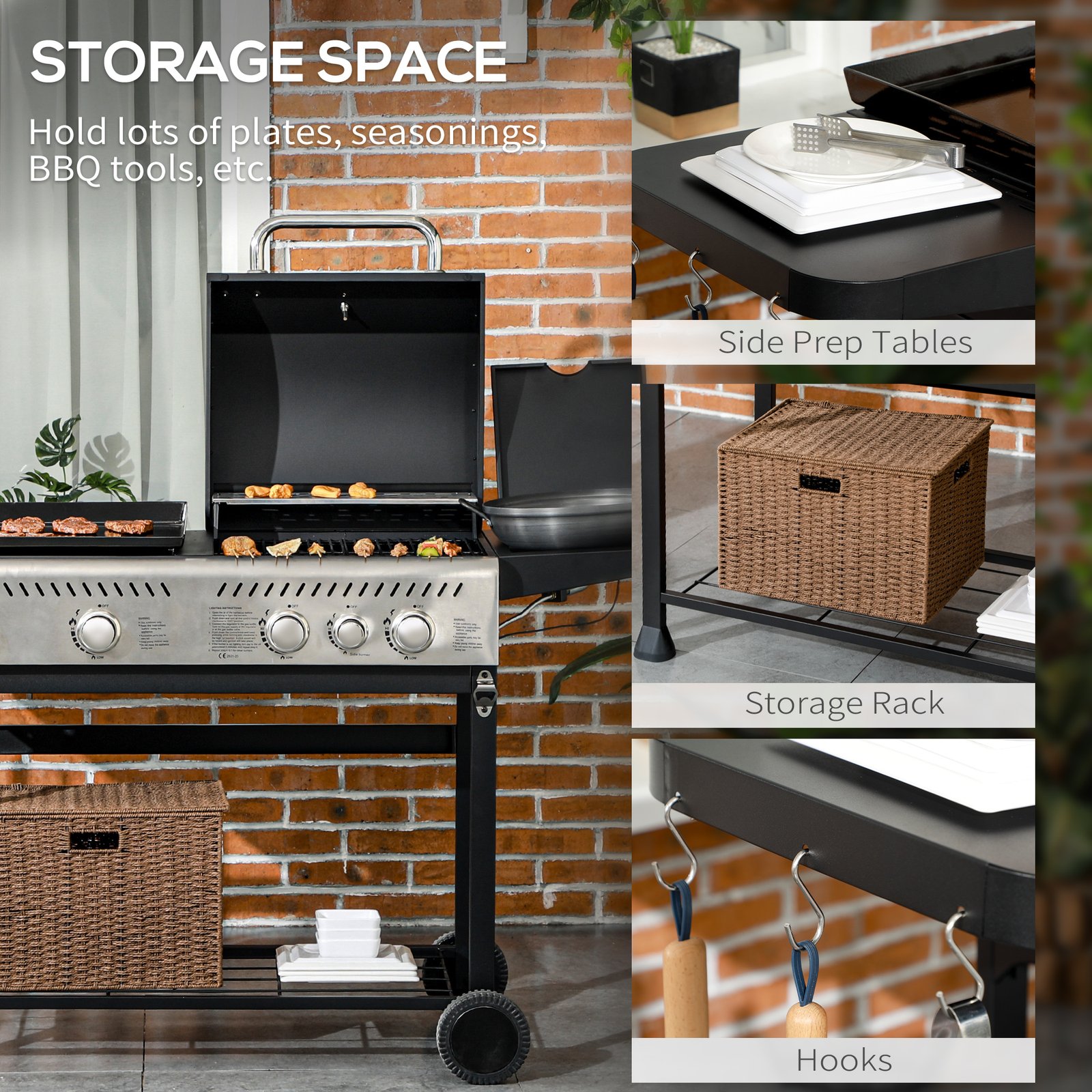 - Weight Capacity: (grill grate) 10 kg, (bottom shelf) 20 kg, (side shelf) 5 kg