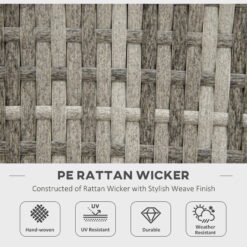 Enjoy garden warmth and ambiance all year-round with this Outsunny fire pit table. Rattan-effect gas fire table is stylish, looks great matched with other furniture. The tabletop is fitted with a centre fire pit – the 50,000 BTU burner is powerful and produces a clean smokeless burn. The flame can be adjusted too. The thermocouple closes the valve if the flame goes out for safety – no leaking gas. The patio fire pit is complete with a glass guard, protecting against flying sparks.