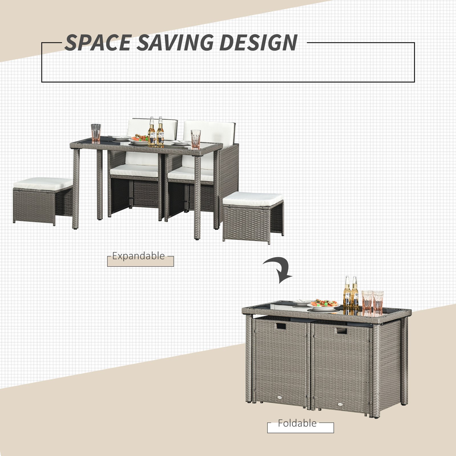 This Outsunny 5 piece garden dining furniture is an ideal solution for a small garden, patio or conservatory. Comes complete with 2 chairs, 2 footstools and a table, ideal for any outdoor setting. The rattan corner sofa dining set is made from a steel frame construction and covered with PE Rattan weave, this corner rattan dining set will look perfect in any dcor. The garden sofa dining set also has the ability for the chairs and stools to be stored under the table when not in use.
