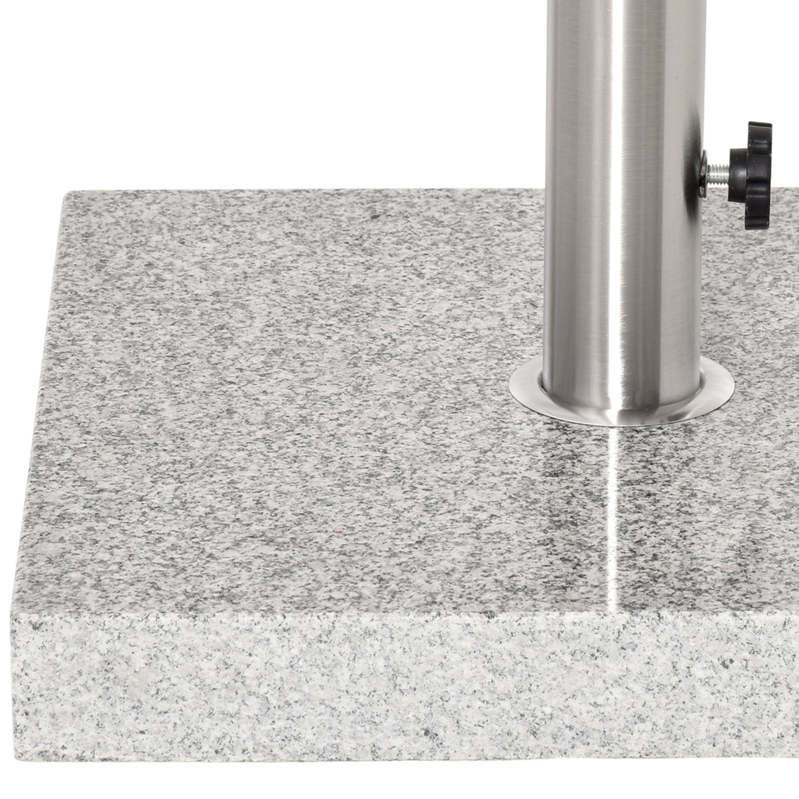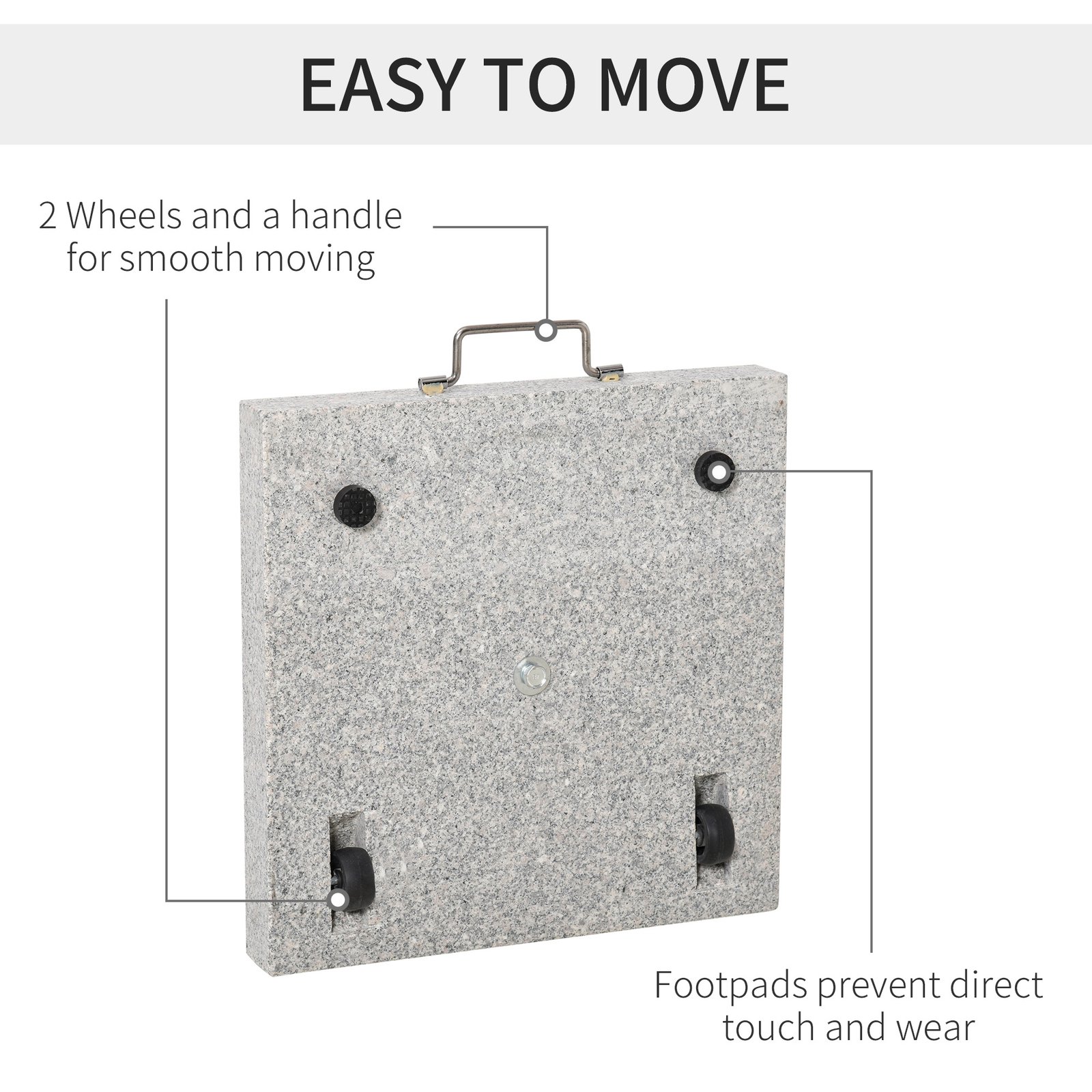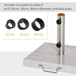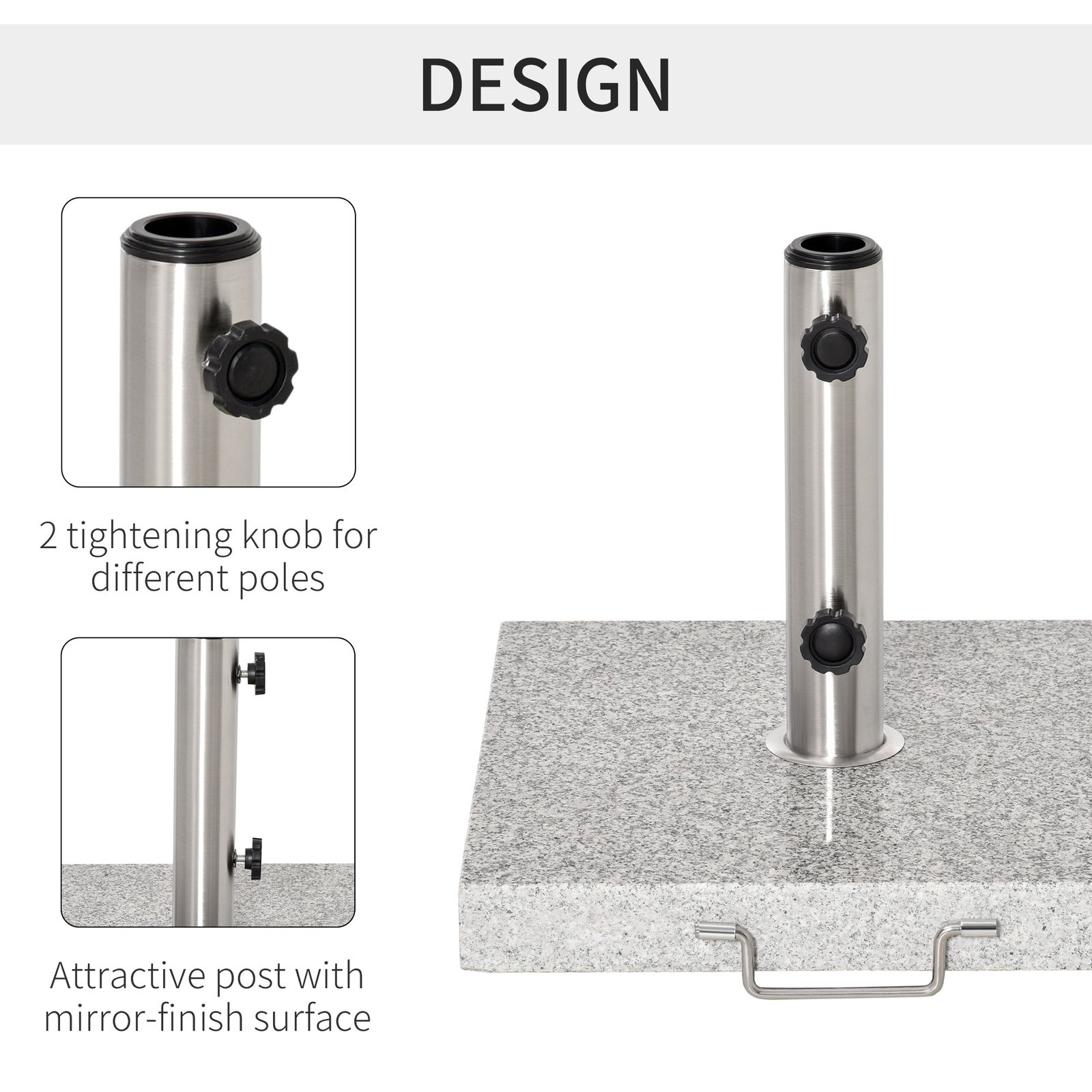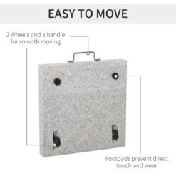 - Made from marble and stainless steel Perfect for outdoor garden, park, patio, deck, yard, poolside and backyard Suitable for 3.4cm/3.8cm/4.8cm sized umbrella pole With handle and 2 wheels for smooth movement With 2 foot pads for preventing marbles direct touch with ground Rotary knob for fixing umbrella pole Stand column with mirror surface processing made of stainless steel pipe Marble base surface with polishing process Space saving and portable