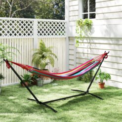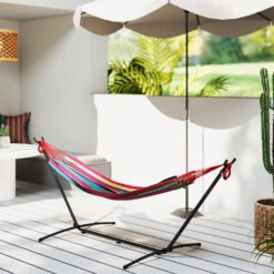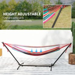 This Outsunny portable hammock with modern shape and multicolor stripe design, can be an ideal addition to your patio, yard or garden. No more searching for the perfect tree to hang your hammock, this free standing hammock supported by a freestanding frame. Adjustable height and portable design bring more convenience for using. With this hammock with frame, you can take comfortable naps on your porch, under a tree or by the pool for hours of relaxation.