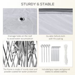 Transform your garden or terrace into a stylish haven with the Outsunny folding gazebo, designed for outdoor enthusiasts who value convenience and elegance. This gazebo offers effortless setup and takedown, saving you time and energy. Its robust steel frame withstands frequent use and diverse weather. Adjustable heights and mesh curtains provide a private, breezy space, ensuring comfort and sophistication. After the event, simply pack it into the included carry bag for easy storage.