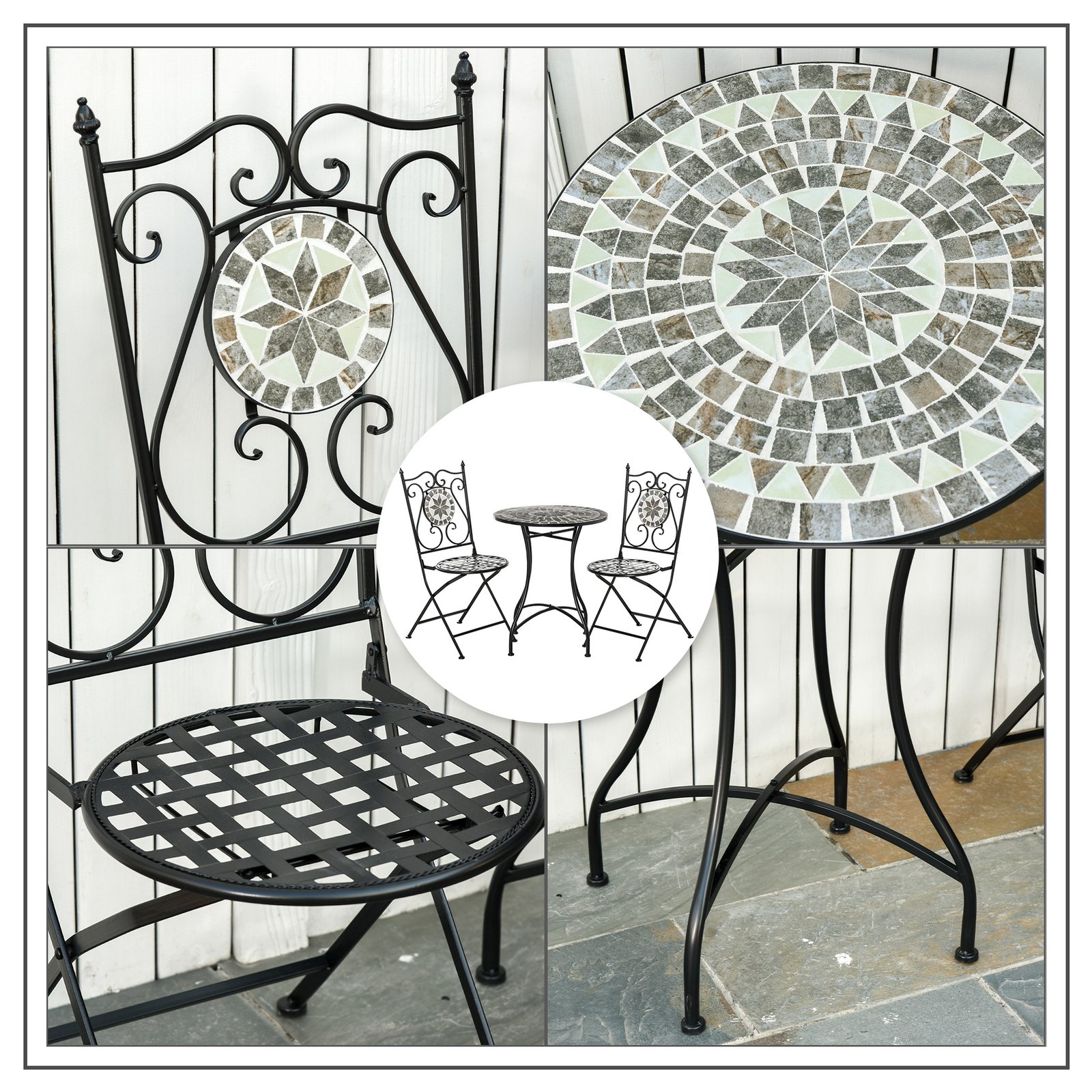 • THREE PIECE BISTRO SET: Includes a small round table and two folding chairs. The small and compact size of the mosaic bistro set is ideal for gardens, balconies, patio areas and other outdoor areas.