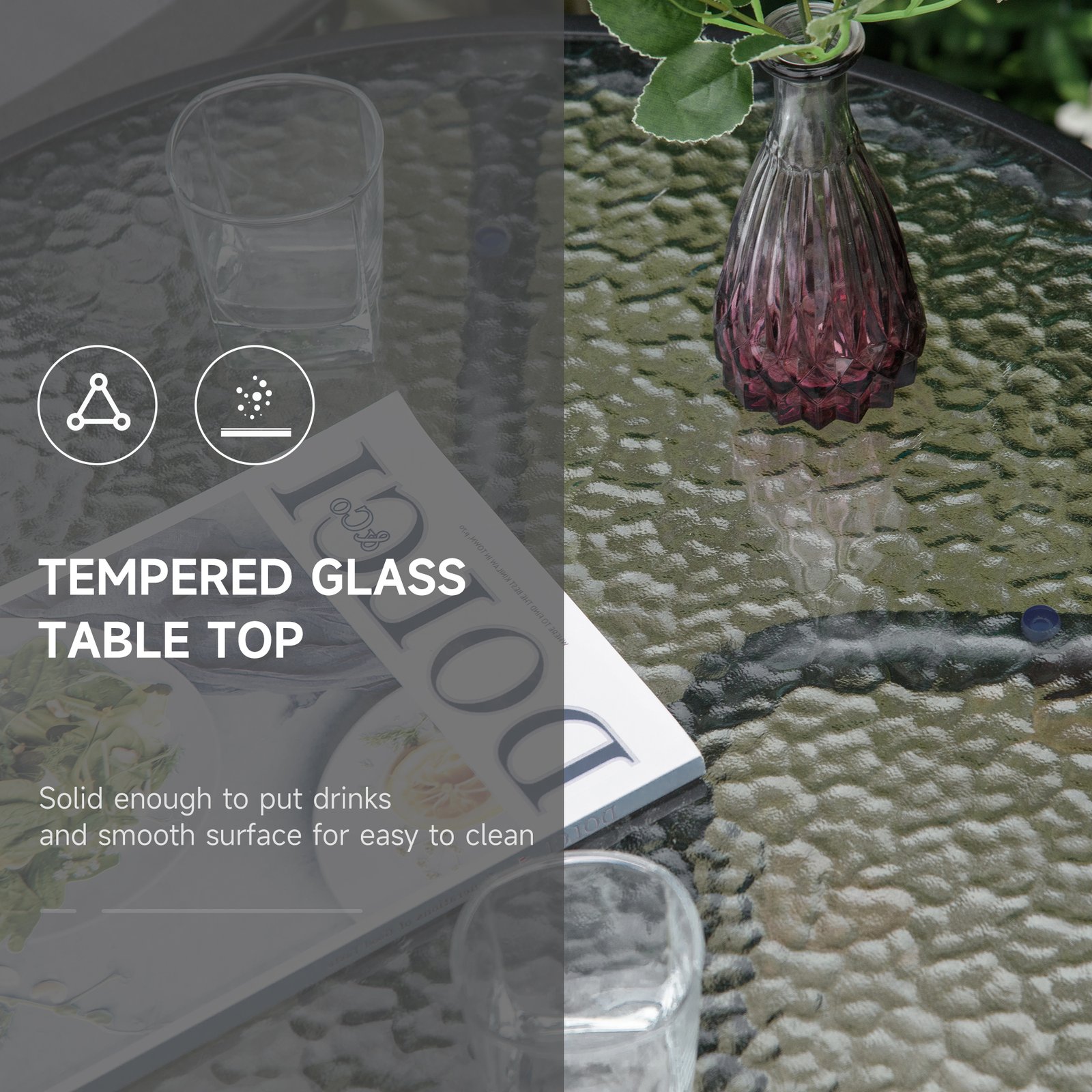 • Glass table top: The table of the garden furniture is with a sleek and smooth tempered glass top for a reliable holding place to keep everything near.