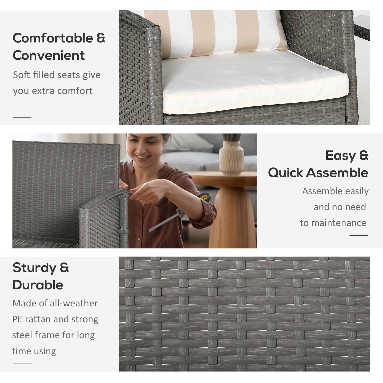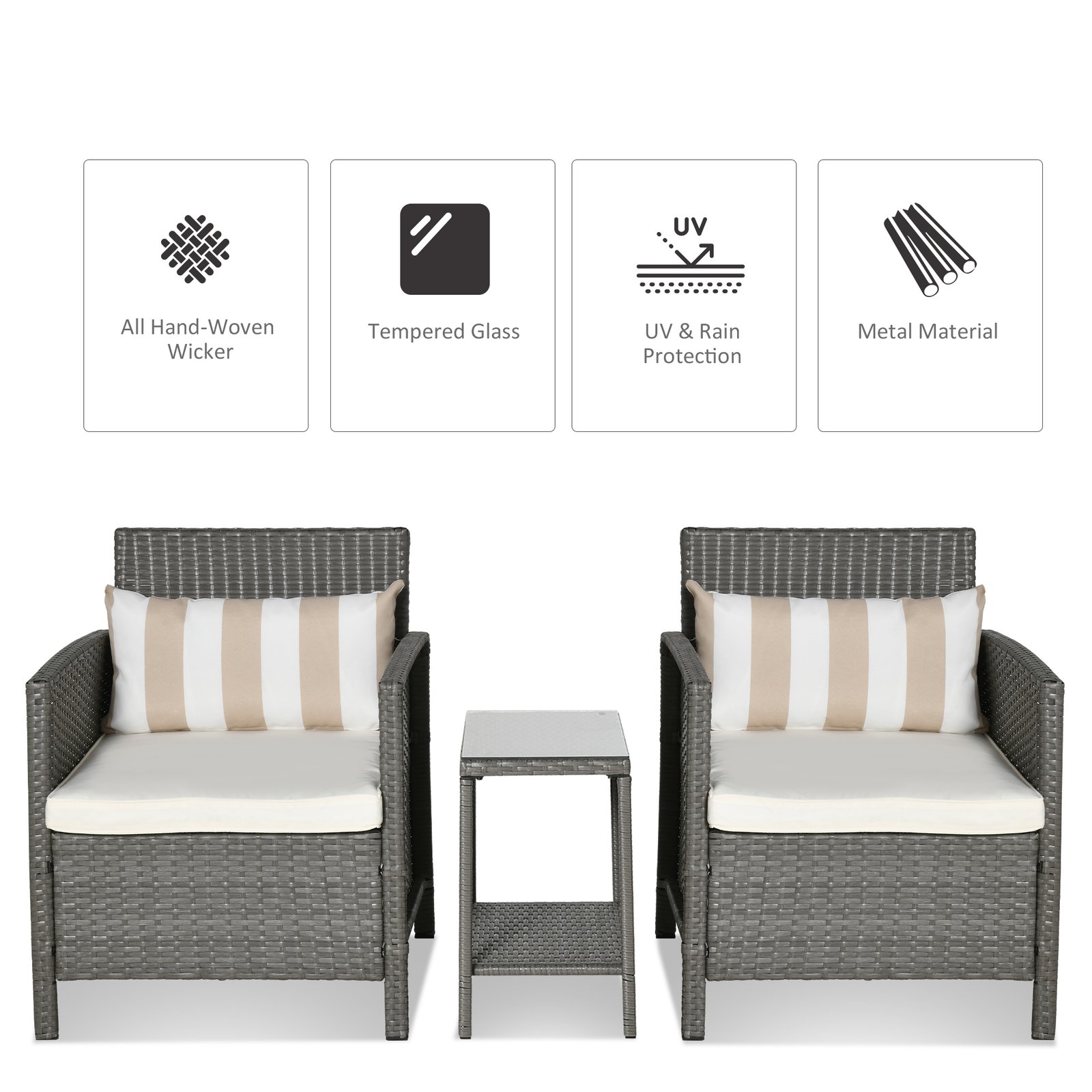 Make the right choice for the upcoming Summer season choose this three-piece dining set from Outsunny for endless hours of comfort and joy. In a contrasting cream tone, thick cushions are placed on the seats for comfort, with a stylish striped bolster cushion also included for extra style all with removable covers which can be washed clean to keep them fresh and hygienic. The set is completed with a matching two-tier table, with a tempered glass top for a chic finishing touch.