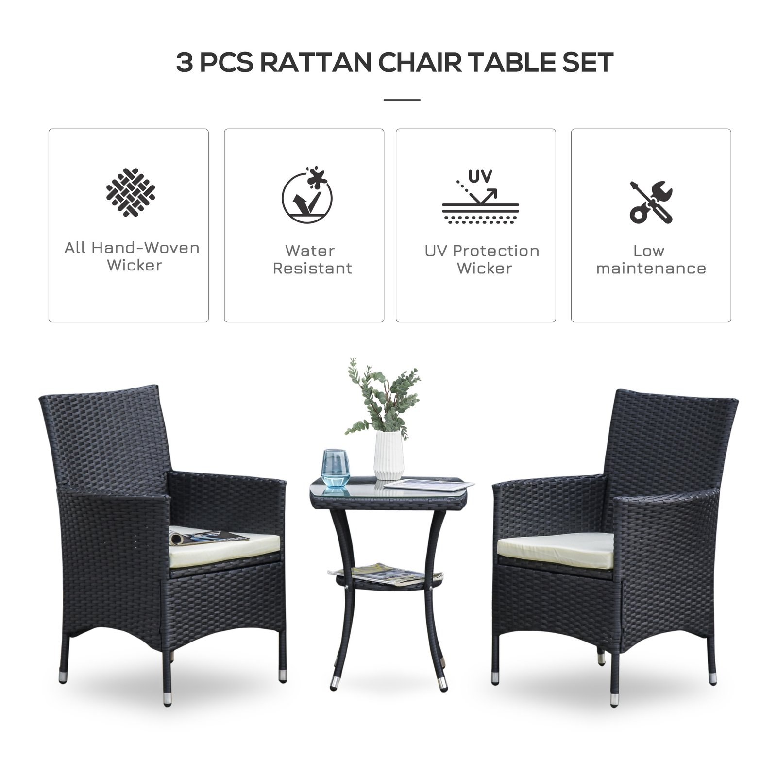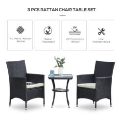 Outsunny 3pcs furniture set perfect as a conversation set for any patio, deck, sunroom, or garden, our Outsunny rattan coffee table and chairs will create a classic centerpiece in any setting. Made from PE wicker rattan, this set is UV resistant, water resistant, and is built to last. These lightweight chairs and table are easily movable and simple to store as the seasons come and go.