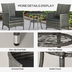 This Outsunny outdoor bistro set is great for any patio, garden, porch and similar spaces. Frames of the rattan bistro set is made from powder coated steel mean a strong structure, wrapped in plastic PE rattan wicker for garden rattan style. UV and water resistant. Matching table gives a handy side surface, with a safe and sleek glass top. Repeat and use, season after season.