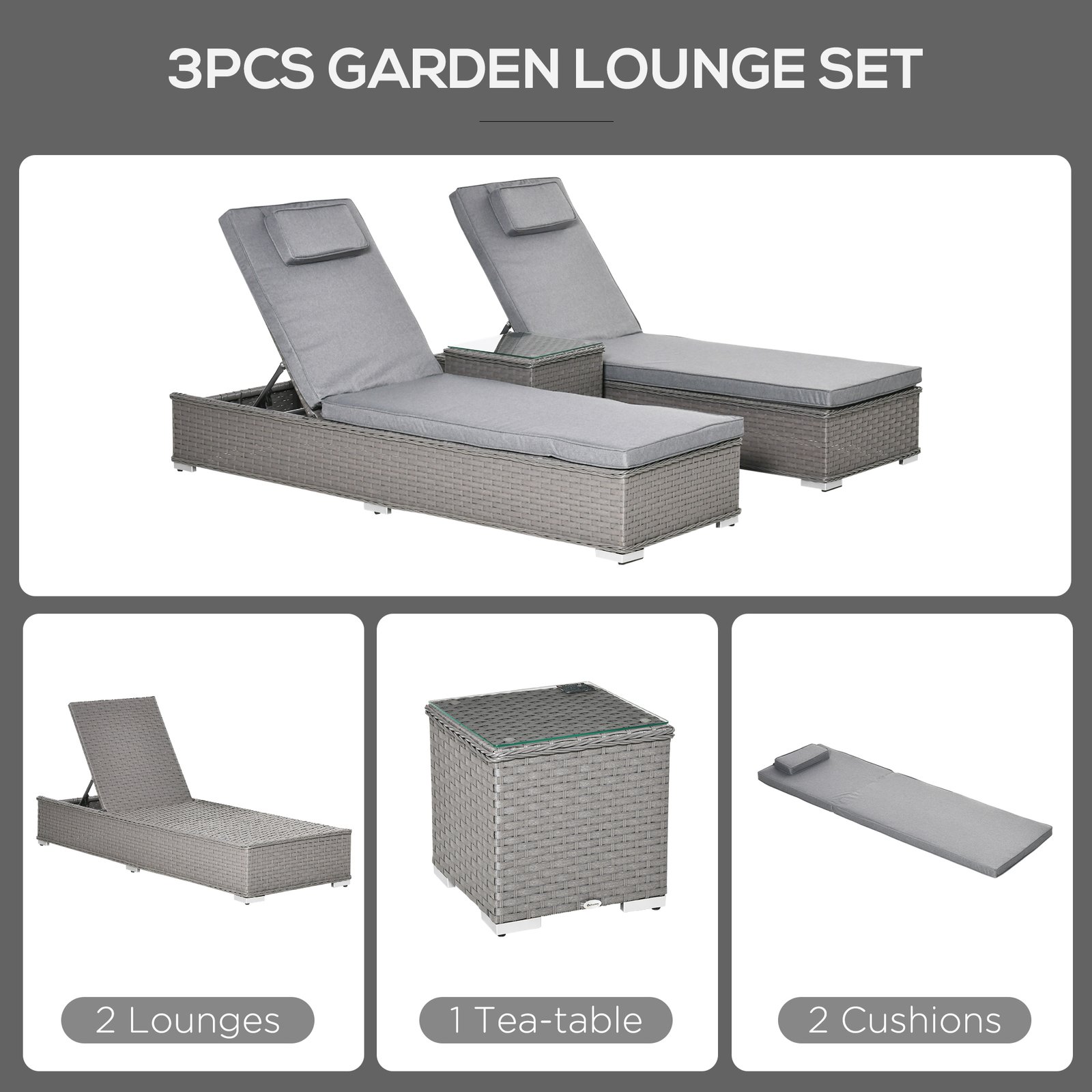 Make the summer days better than ever before with this three-piece rattan sun lounger set from Outsunny. Consisting of two loungers and a small matching side table. Adjustable to five different positions (going back as far as 180) for optimum comfort, each lounger is fitted with a grey padded cushion which covers the full length and width, with a head pillow to support you neck and head as you lean back underneath the warm and welcoming glare of the sun.