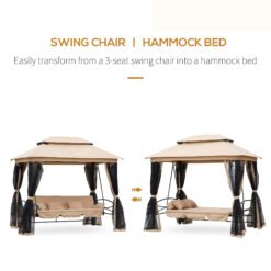 The 3 seaters multi-functional swinging garden chair can be converted to a single bed in seconds. With cushions, two soft pillows and two neck rolls, swing seat with canopy offers optimal comfort whether you are sitting or lounging. The removable zippered mesh curtains on all sides protect you against mosquitoes and allow for fluid air circulation. The gazebo swinging chair bench with a 340kg weight capacity allows you to relax on the comfortable swing chair hammock with your loved ones.