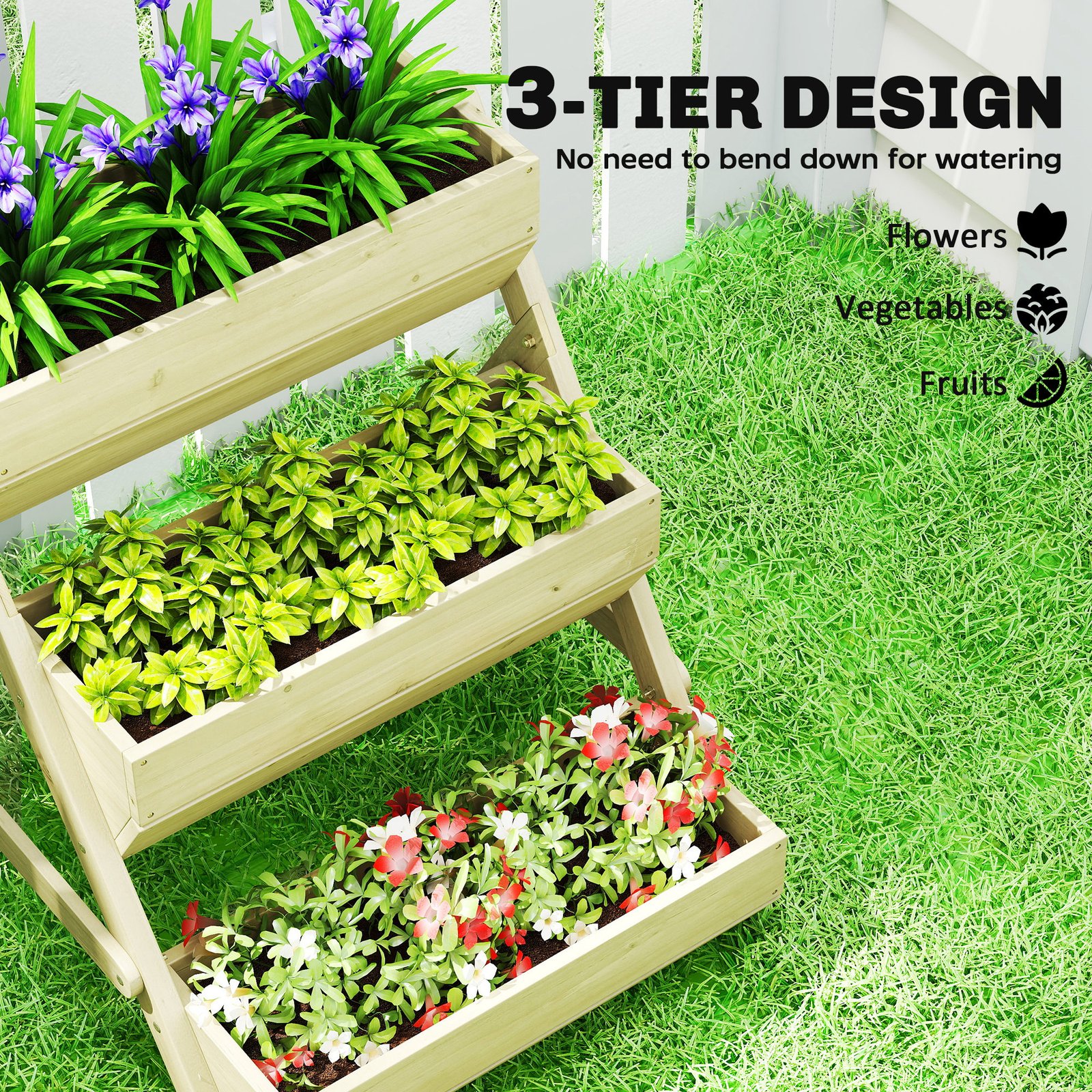 • Wooden structure: Solid and tough, with paint coating for extra protection. ‘A’ legs for balance, top raised planters are elevated for protection from insects and bugs.