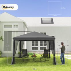 A handy shelter for your outdoor gatherings, assembled oh so quickly – bring this Outsunny 3 x 3(m) pop up gazebo with sides to your garden, this season and beyond. The three-level adjustable metal frame means a strong core, which can set to a height most suitable for you. Comes with removable mesh curtains – create a private and open feel easily. Bag included to store and carry easily.
