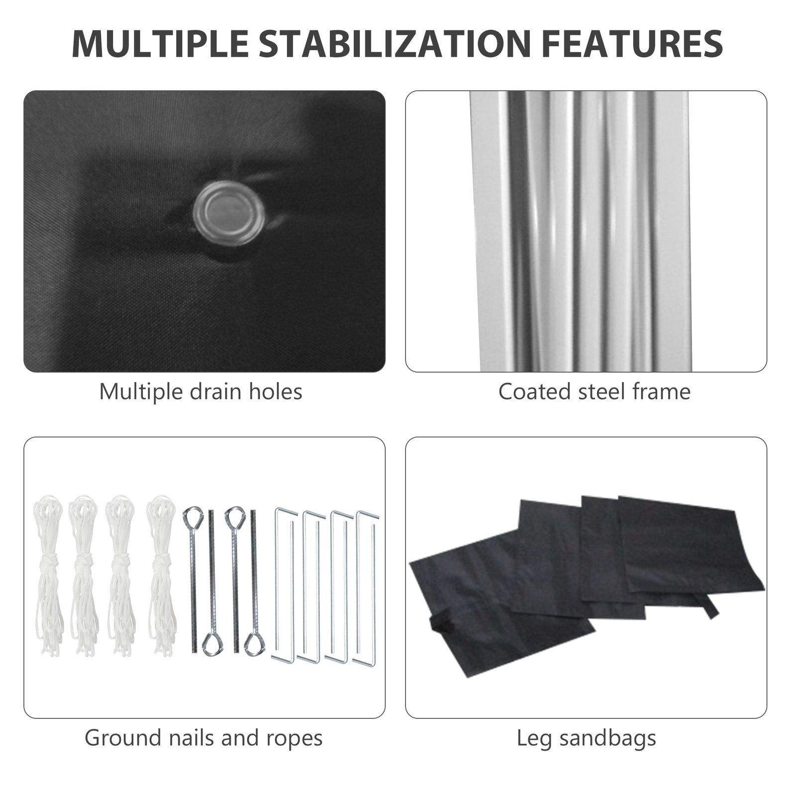 - Guy ropes, ground pegs and sandbags included for extra support and weight