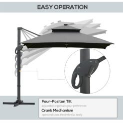 • FOUR-POSITION TILT & CRANK MECHANISM: The crank mechanism allows you to open and close the umbrella quickly and easily. The four-position tilt canopy with its adjustable angle fully suits your preferences, and you can relax all-day long with protection.