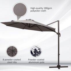 Ensure you keep yourself protected enjoying the sun with this large paraso from Outsunny. Made from powder-coated aluminium, the strong and durable central pole is resistant to rusting, peeling and corrosion to provide you years of use outdoors. Connected to the frame via eight steel ribs for extra strength, the polyester canopy is easy to clean and will not fade, as well as protecting you from harmful UV rays. Using a crank mechanism for easy opening and closing, the canopy is able to rotate a full 360 degrees via the foot pedal to suit your shade needs. A piece which every garden needs.