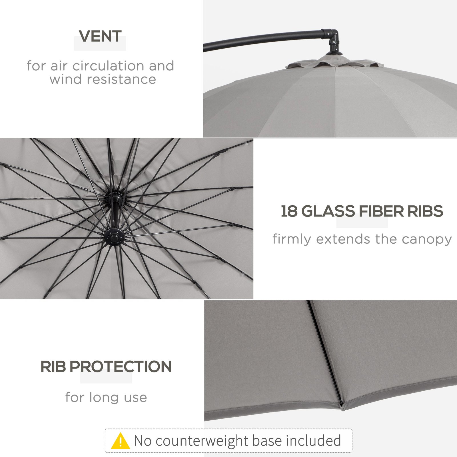 • METAL FRAME: The cantilever parasol with base included features a tough structure which is powder coated for extra strength so the outdoor parasol stands in place. Connected to the canopy with 18 fibreglass ribs for stability.
