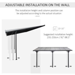 Transform your garden into a haven of comfort and style with the Outsunny aluminum-framed lean-to pergola. Designed for families who cherish outdoor gatherings, this pergola offers a perfect blend of elegance and functionality. With its robust construction, this pergola promises durability against various weather conditions. Its polycarbonate roof effectively blocks harsh sunlight, ensuring your family and guests are shielded from UV rays while basking in a gentle, warm glow.