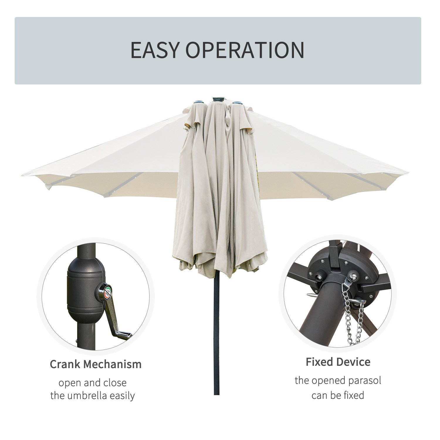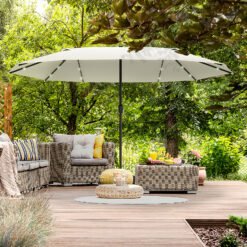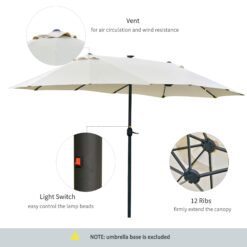 It’s time for your garden to shine with this solar parasol from Outsunny. A stylish design, the sun parasol features 36 lights on the frame ribs to light up your outdoor seating when dark. The large double parasol garden creates plenty of shade, protecting you from direct sunlight. Using a crank mechanism for effortless opening and closing. If you’ve been searching for a new way to change your garden, then our outdoor umbrellas are the answer. Matching base: Outsunny sku 84D-089.