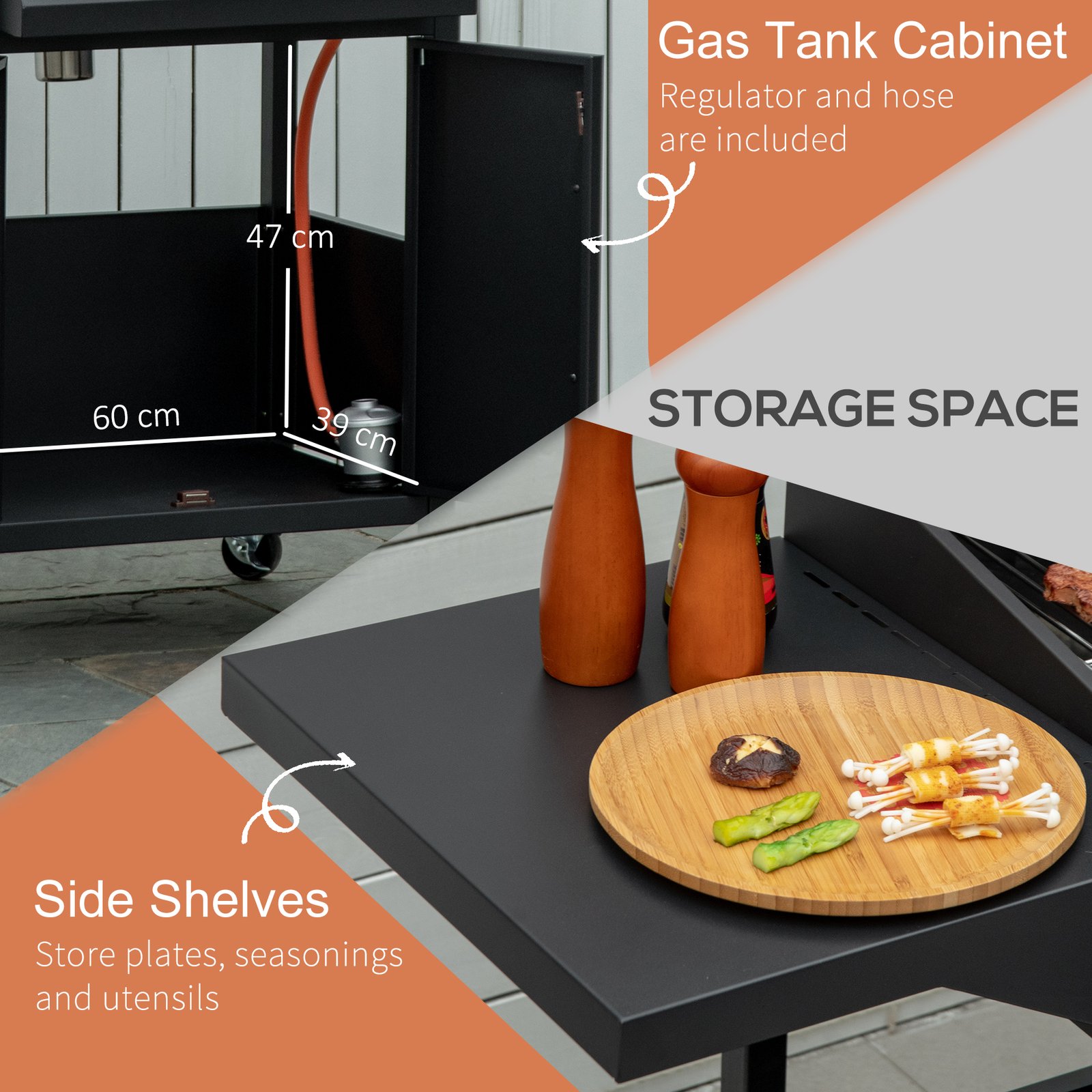 - Weight Capacity: (grill rack) 10kg, (shelf) 5kg, (cabinet) 10kg
