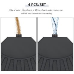 Ensure your parasol is always held firmly in place with parasol weights from Outsunny. Made from strong HDPE plastic, our weights for parasol are comprised of four pieces which fit together easily and each piece holds up to 13kg of water weight and 15kg of sand weight. When empty, the parasol base weights are light enough to carry around, allowing you to pick your perfect sunshade spot with ease, and these parasol bases can also be cleaned quickly. Whether you wish to use this for your garden or coffee shop, this patio umbrella base is suitable for you.
