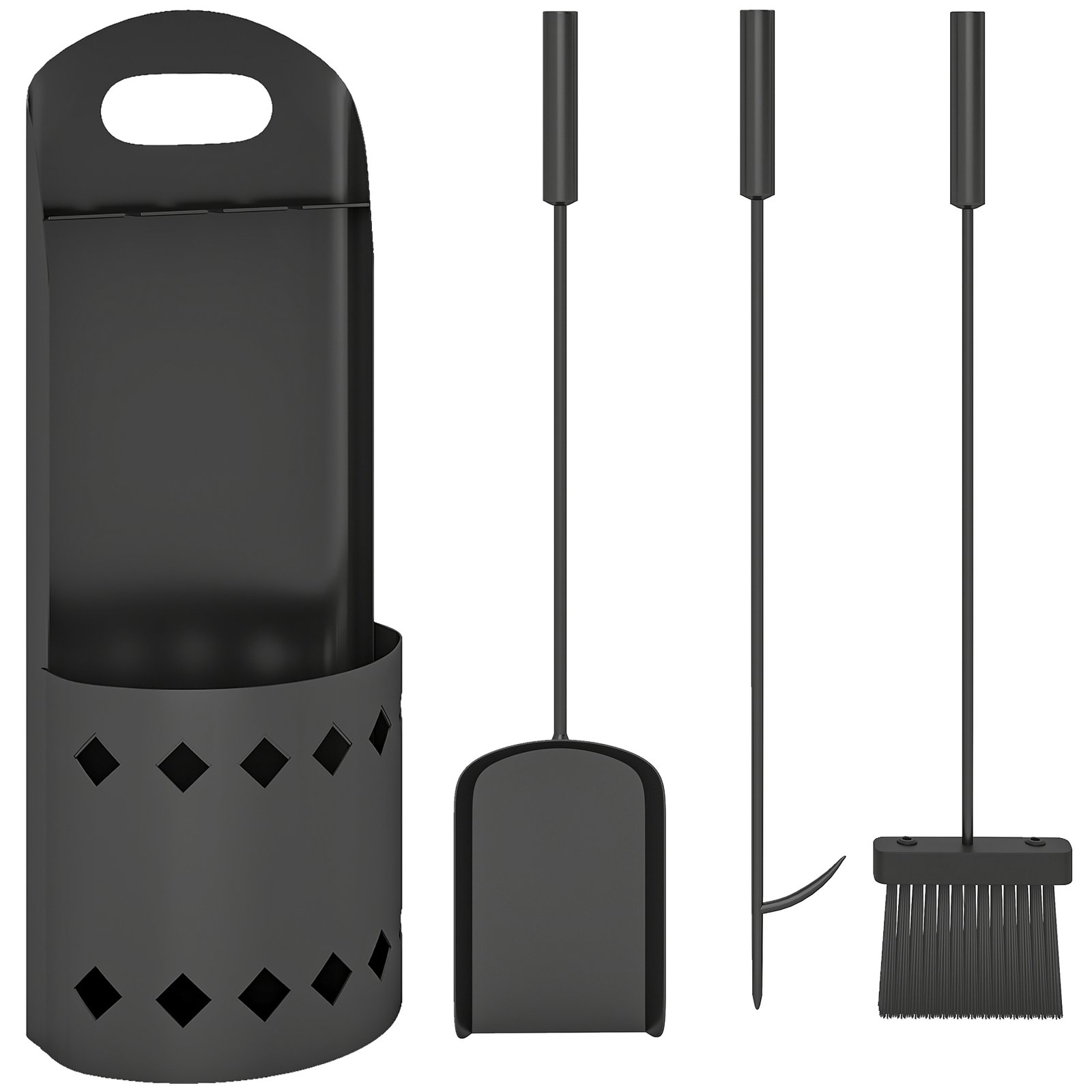 - Four-piece set includes a broom, a shovel, a poker and a bucket