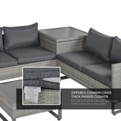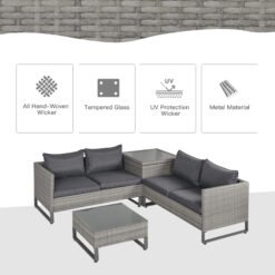Keep comfortable in a tidy and stylish spot outdoors which this seating set Outsunny. It comes with two loveseat sofas, a corner storage table and large table. The frame of each piece is made from powder coated metal for a tough core, wrapped in PE rattan for extra protection. Sofas come with seat and back cushions to keep you comfortable; both tables are fitted with tempered glass tops for a solid holding spot for everything you need close to you. Easy to maintain and stylish, this is a fantastic outdoor lounging set to see you through the season and beyond.