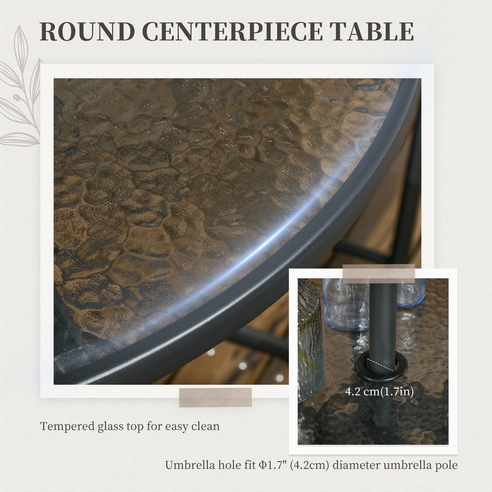A classic outdoor piece with a modern rattan twist. Powder coated steel frames mean a strong core, with plastic wicker seats to hold you comfortably in place. The matching round table features a middle hole, to hold parasol umbrellas sized at Φ42mm. Enjoy your time outdoors in comfort and style.
