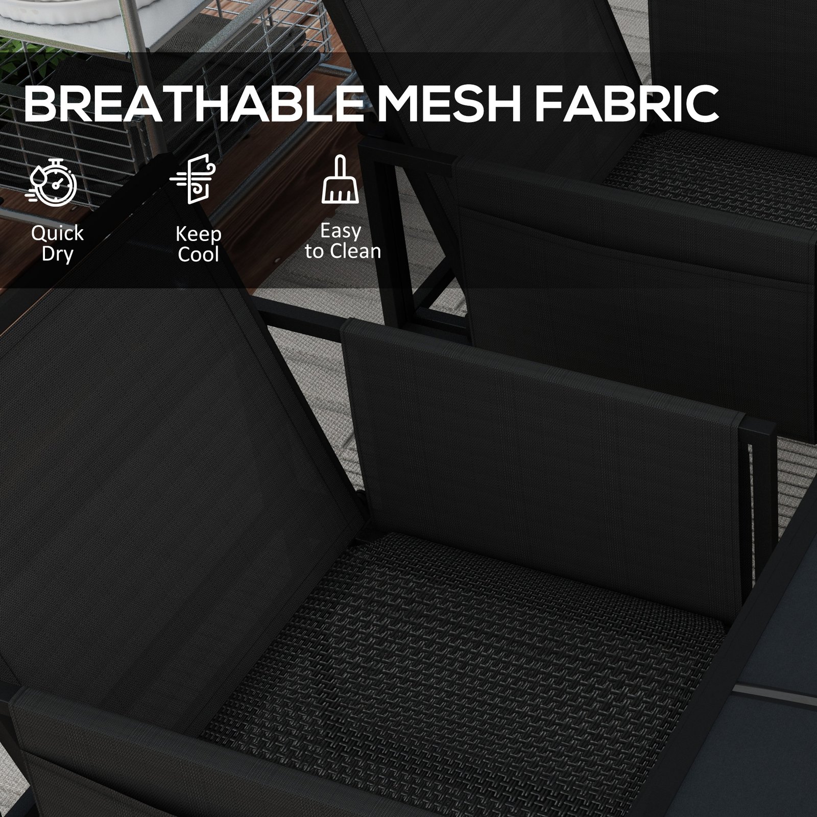 This Outsunny patio table and chairs set is here to relax with friends. Metal frames makes each piece robust. The chairs are fitted with breathable mesh for ventilation. The backs fold down to tuck away under the table – save space when not being used.