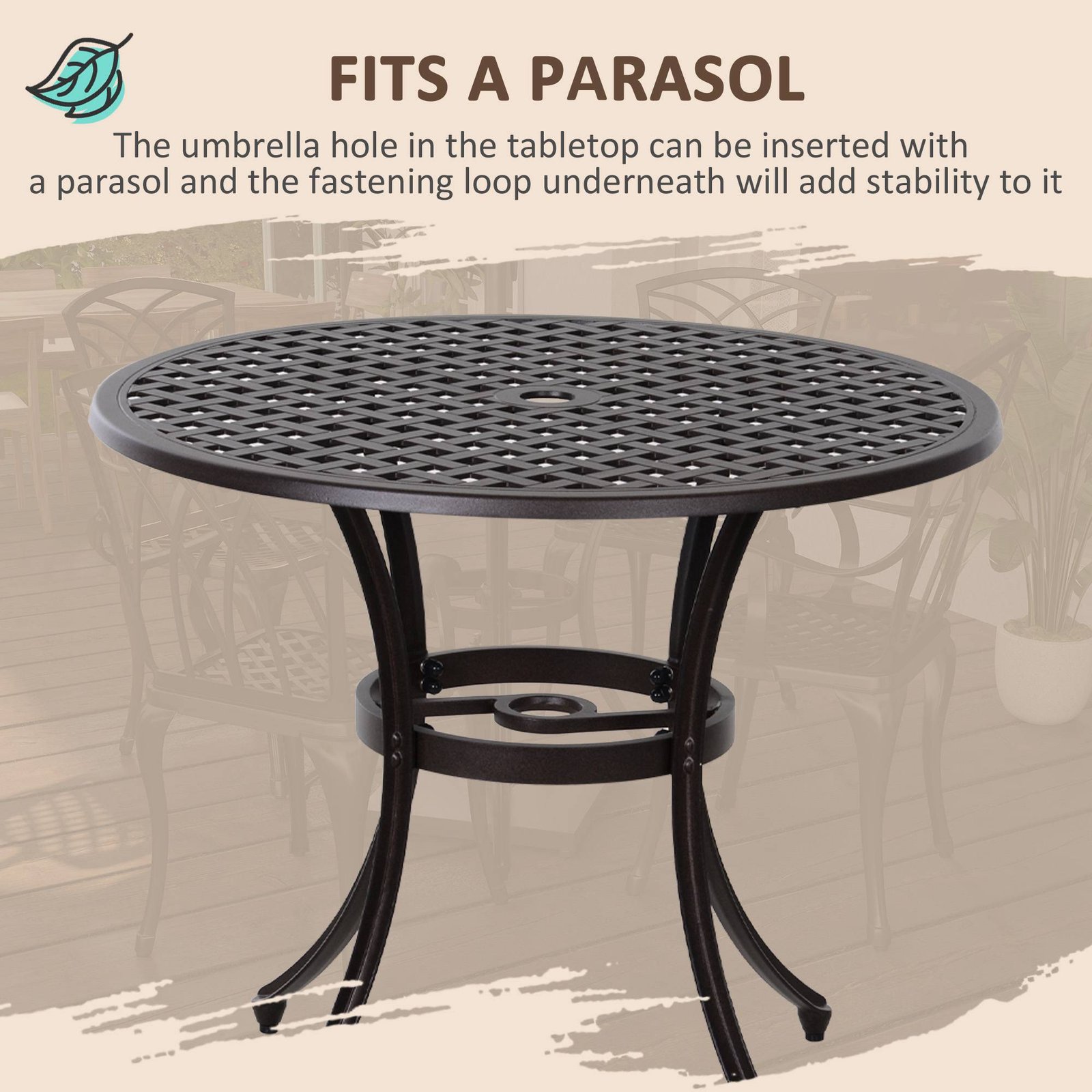 • Cast aluminium frame: Strong, resistant to rusting and tough, the garden table and chairs are reliable for outdoor use all-year round. Chair backs are moulded into an attractive cut-out design.