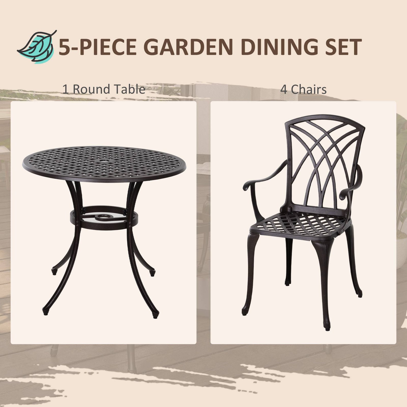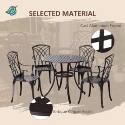 Outsunny 5 Pieces Garden Dining Set for 4, Cast Aluminium Outdoor Dining Set with 4 Armchairs and Round Dining Table with Parasol Hole, Garden Furniture Bistro Set, Brown