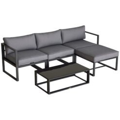 Understatedly stylish and extremely comfortable, this five-piece garden sofa set has it all. Includes an armless chair, two corner chairs, a footrest and coffee table. Padded cushions and pillows on the seats and back for comfort, with removable and washable covers for hygiene. With a tempered glass top, the coffee table adds a sleek finishing touch to the set. A fantastic addition for your garden and outdoor areas, youll love inviting friends over to relax and dine with you.