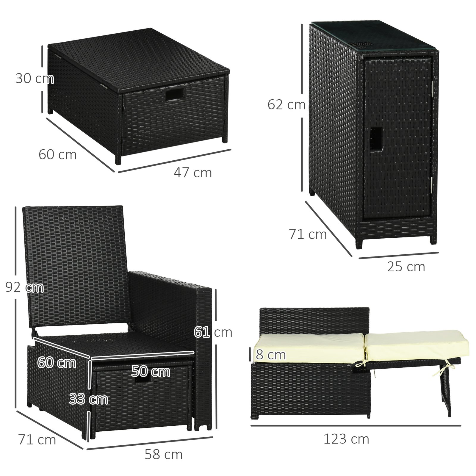 This Outsunny set combines reclining garden furniture, with storage and most importantly, somewhere to relax with a friend. It comes with two reclining chairs, two storage footstools and a tempered glass-top table. Both chairs feature a reclining back: set to five different angles so you can relax the way you want to. A steel frame forms each piece for strong support, wrapped in stylish plastic rattan: a garden-ready look to be used this season and beyond.