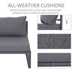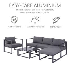 Understatedly stylish and extremely comfortable, this six-piece garden sofa set has it all. The set is made up of a armchair, a middle seat, two corner seats, a large footstool and a table, with all pieces made with a powder-coated aluminium frame for long-lasting use and strength. Plush padded cushions on the seats ensure all day comfort and the covers can be taken off and washed. With a tempered glass top, the coffee table adds a sleek finishing touch to the set.