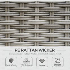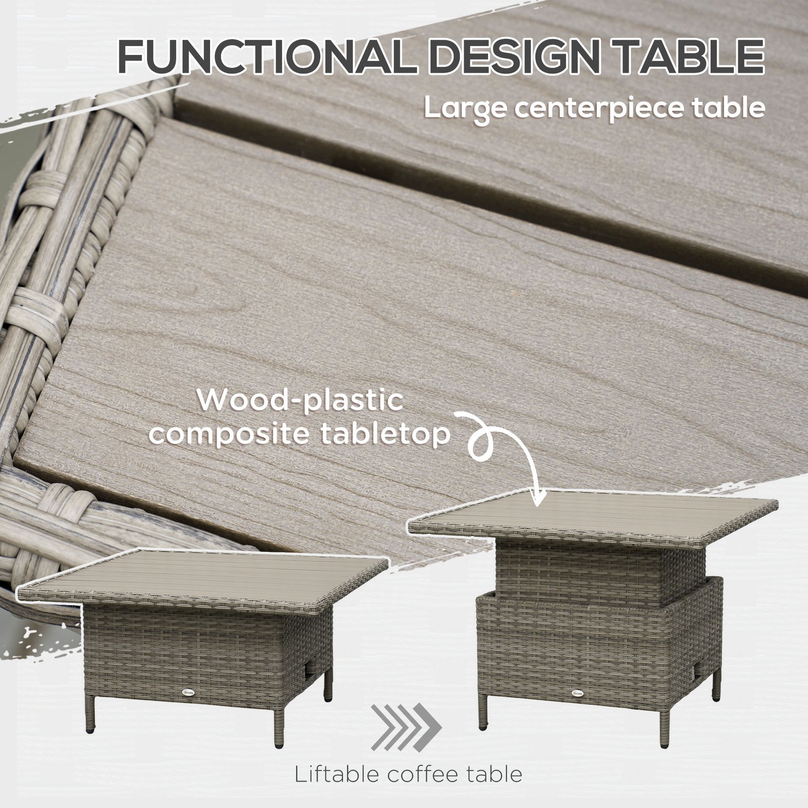 Relax together in comfort and style in this Outsunny rattan corner sofa set., Six pieces: corner chair, right-handed loveseat, left-handed loveseat, long footstool, square footstool and a liftable coffee table – arrange in a way you want. Metal frame for a strong core, wrapped in plastic rattan for support, durability and style. The table can be raised or lowered-dine at a level you want; comes with a wood-effect top for extra beauty.