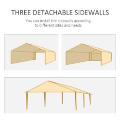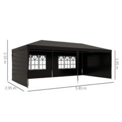 Create safe shelter with guests when entertaining outdoors – do it with this Outsunny 5.83 x 2.95m marquee gazebo with sides. It’s formed of a steel frame for a tough structure, with a durable plastic canopy covering half – no front for an open feeling. Six guy ropes and 12 ground pegs are included to pin to the ground for extra stability. For many events like BBQS, family parties, wedding receptions, BBQs and more. Finished with handy adjustable feet.