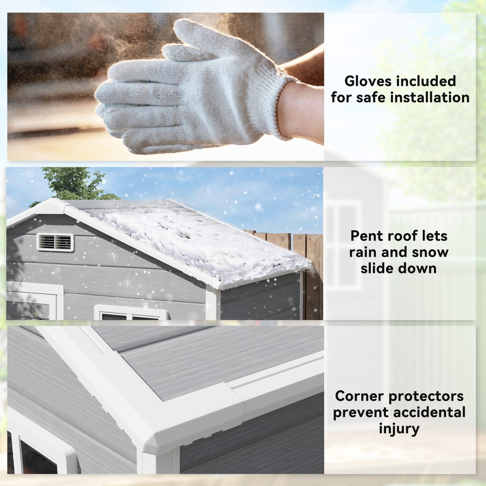 - Integrated floor prevents rainwater seepage, protecting contents