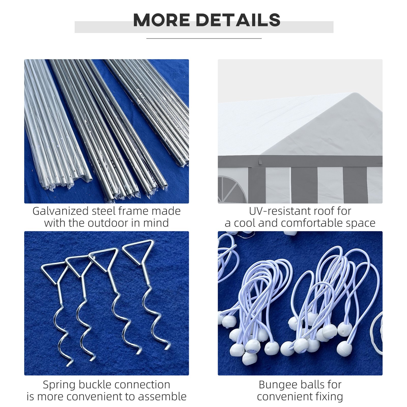 • Galvanised steel frame: A strong and sturdy structure for this party gazebo. Four guy ropes, four spiral stakes and 16 ground stakes included to pin to the ground.