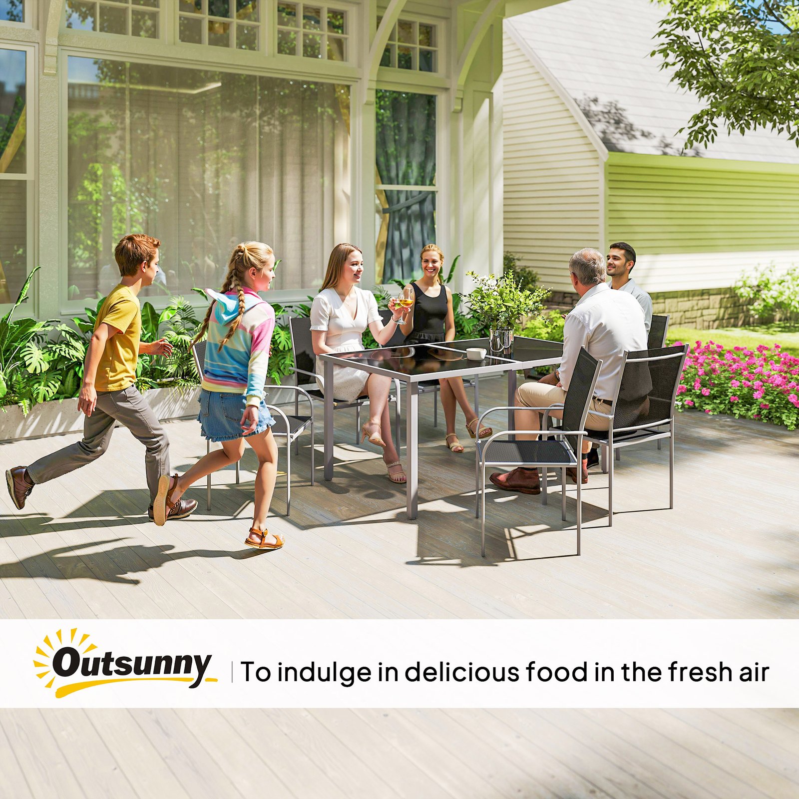 Whether it’s for enjoying your weekend brunch, evening dinner, or catching up with friends, do it with this Outsunny metal garden set. Steel frames mean a strong structure, with mesh fabric on the chairs to allow the skin to breathe. Sleek glass-top table. Bring everyone together in simple style with the outdoor dining set.