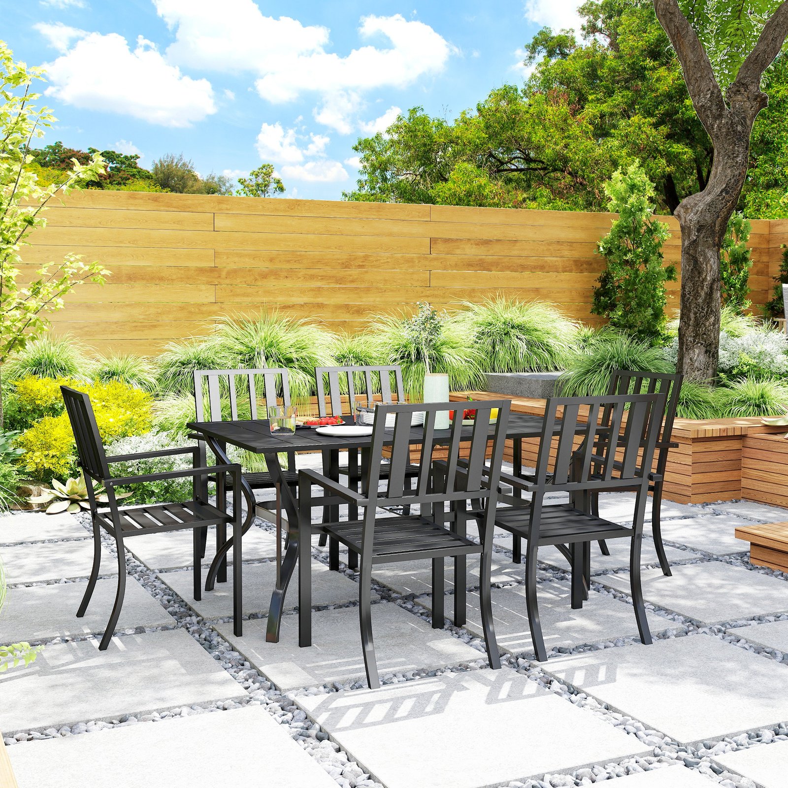 This Outsunny minimalist patio table and chairs set lets you host weekends, weeknights and more in style. Steel-framed chairs and a tall matching table are built to last through any activity. As a spacious six-seater set, it’s suitable for summer entertaining – gathering friends and family together for many memories. When not in use, you can stack the chairs on top of each other to save space.