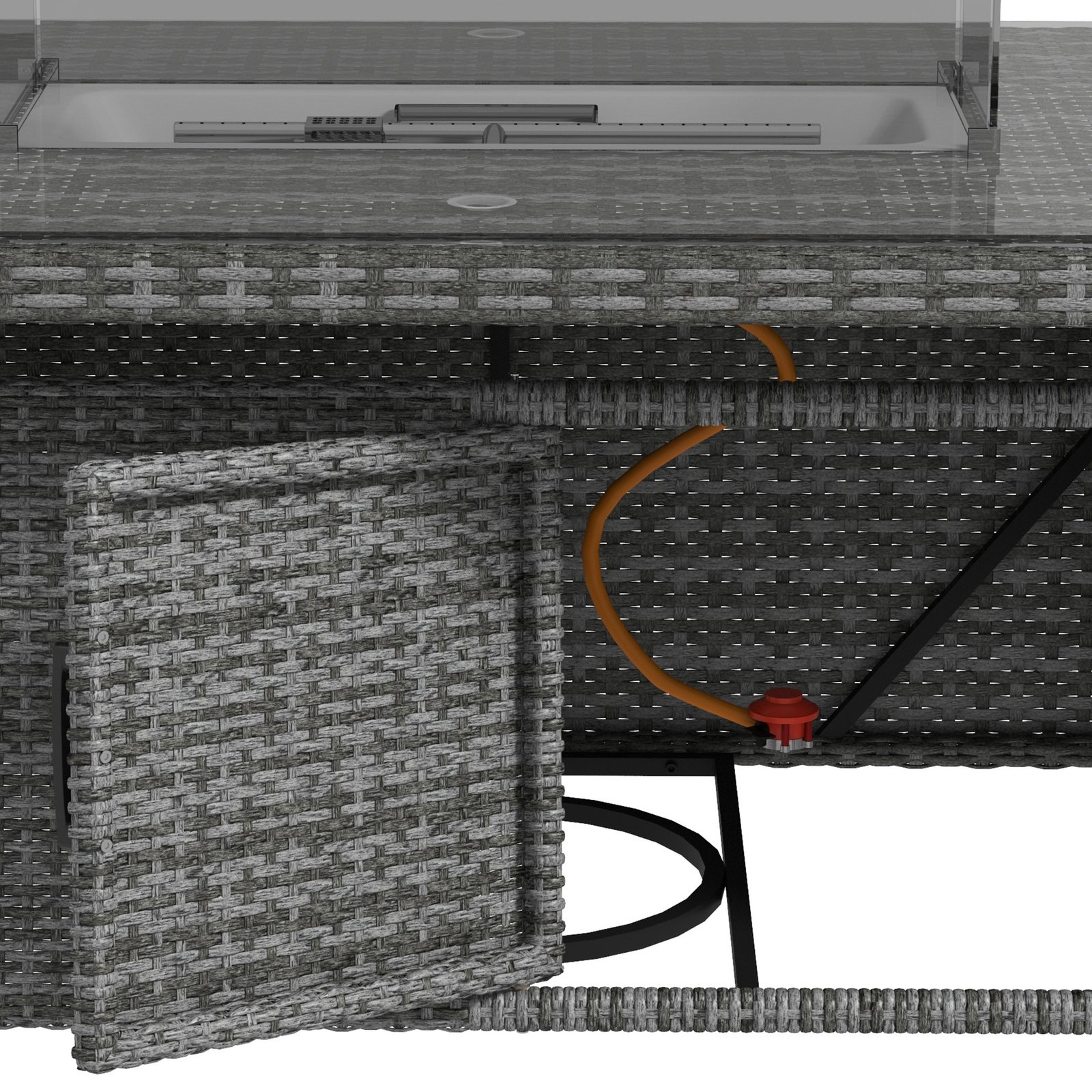 Gather round with company, with the great amount of warmth and ambience. This Outsunny outdoor garden furniture set comes with six armchairs and a fire pit table. The table is fitted with a 50,000 BTU burner in the middle which expels a smokeless and clean burn to ensure an enjoyable and smokeless atmosphere. The glass windscreen creates a safe shield against the flame. All pieces have a strong metal frame with solid plastic wicker. Sink into comfort with the included padded seat cushions.