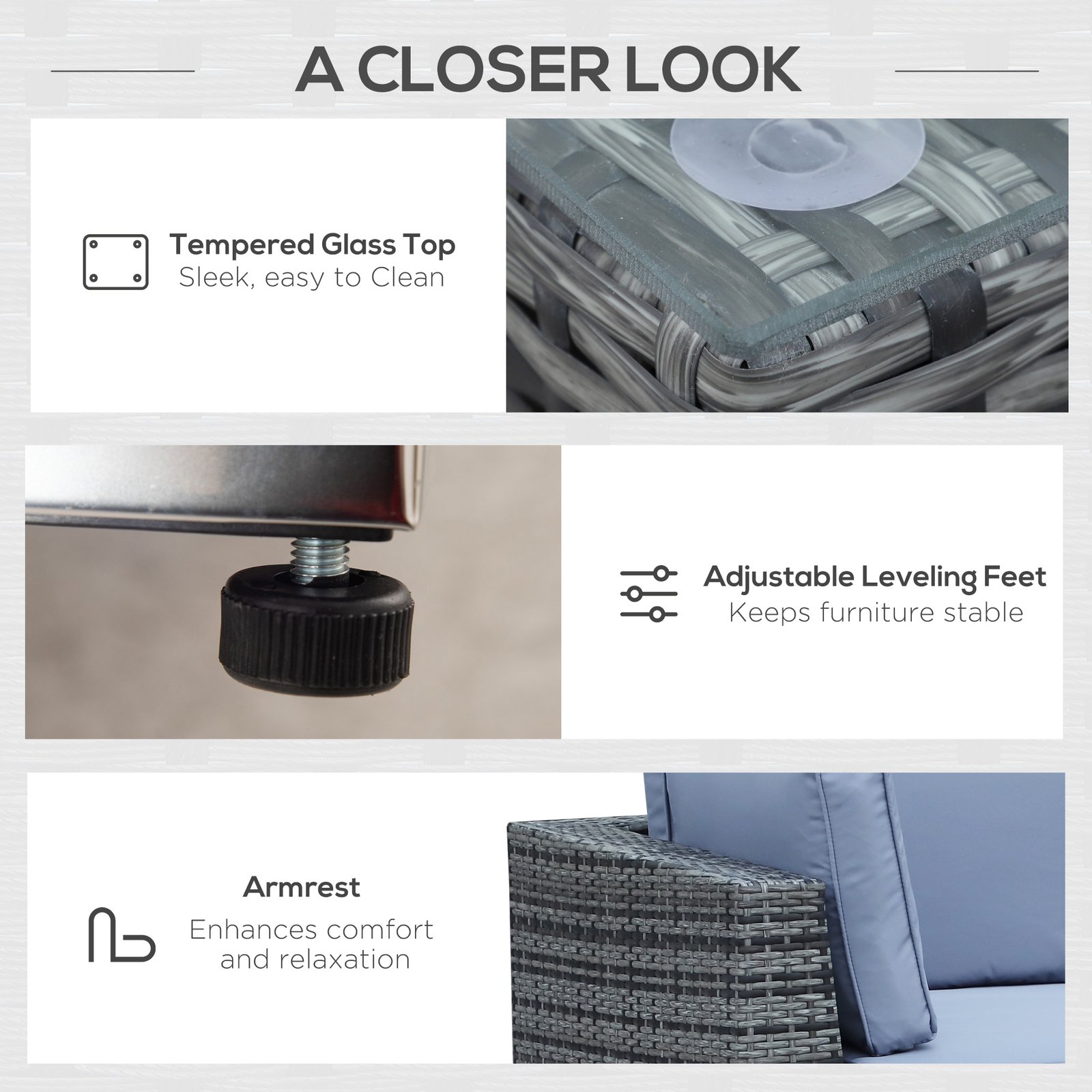 Make your garden stand out like never before with this beautiful outdoor corner sofa from Outsunny. Using aluminum for the base frame of the garden sofa to create a long-term and stable structure, each of the eight pieces included (two corner seats, four normal seats, a footstool, and table) are wrapped in mixed-grey rattan to ensure strength of the conservatory furniture, with a smooth finish that can be wiped clean easily. Padded seats and back cushions provide comfort.